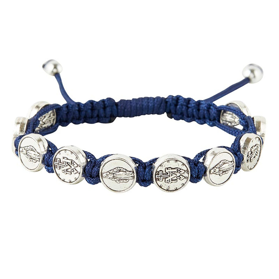 It is a sturdy blue adjustable nylon cord featuring detailed Miraculous Medals that celebrates the vocation of motherhood and references Bible verse Proverbs 31:28. An accompanying full-color floral artwork-adorned prayer card completes the set. Verse reads: Her children rise up and call her blessed.